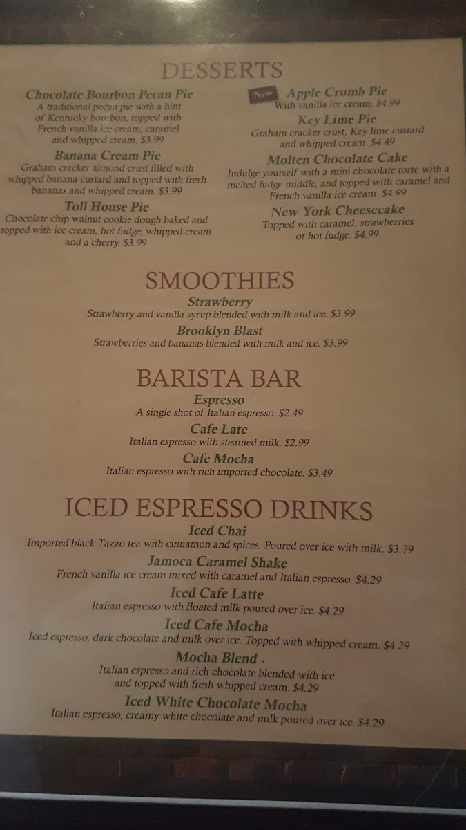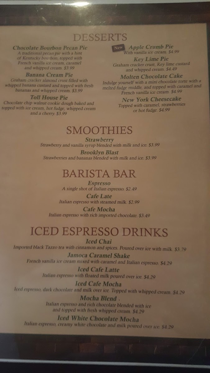 The drink offerings, including iced espresso specials like the Iced Cafe Mocha or Jamoca Caramel Shake, add a subtle touch of indulgence throughout the day, fitting naturally with both casual visits and more relaxed dining occasions.